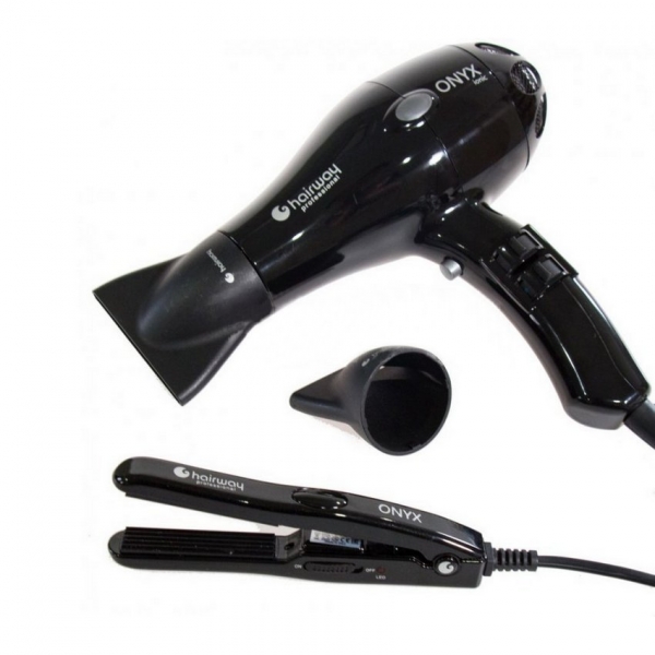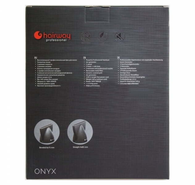 В набор входит фен с функцией ионизации и мини щипцы-гофре. Они предназначены для создания укладок любой сложности и помогут разнообразить образ. Дополнительно комплектация фена HAIRWAY ONYX Ionic ceramic улучшена двумя сменными насадками. Также HAIRWAY ONYX Ionic имеет достаточной длины шнур и отныне не стоит волноваться о своих движениях в процессе работы. Незначительный вес фена только подчеркивает его функциональность и обещает отсутствие усталости, даже при длительной работе с техникой.