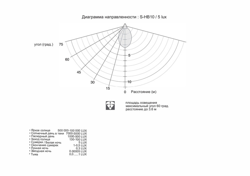 • Прожектор работает в режиме освещения по срабатыванию датчика движения с длительностью свечения 10 секунд.