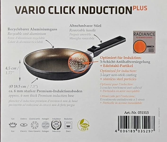 • Новый дизайн ручки. Благодаря технологии VARIO CLICK ручка является съемной и особенно подходит для использования в духовке или просто для экономии места при хранении. Кроме того, ручка имеет защиту от пламени из нержавеющей стали.