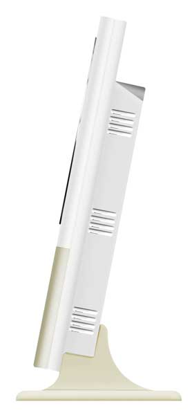 Пластиковый корпус серебристого цвета, дисплей обрамляет широкая полоска белого цвета и тонкий "хромированный" ободок; 4-е кнопки управления находятся на тыльной стороне станции